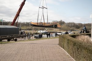 Vandaag kwam er een grote kraan om de zandbank, die in de laatste 3 jaren vóór de haven was ontstaan, weg te halen. Het Waterschap heeft de taak er voor te zorgen, dat de Vecht overal op vaardiepte blijft. Toen alles na een kleine 3 uur klaar was, was letterlijk de weg vrij om het botenhuis met de zomp erin weer in de insteekhaven te leggen.