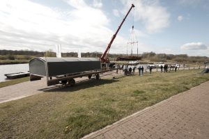 Toen op weg naar het botenhuis, voor het eerst weer onder de Vechtbrug door. Gezamenlijk weer terug naar de haven, waar bleek, dat er een grote zandbank voor de haven lag. Dat was wel even een probleem, maar het is uiteindelijk gelukt. Er moest ook nog “even” de zware mast worden gemonteerd en zo kon de vertrouwde plek weer worden opgezocht.