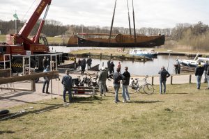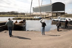 Nu in april moesten het botenhuis en de zomp weer voor het nieuwe vaarseizoen samen worden gebracht in de insteekhaven in Dalfsen. Met de nodige mankracht en ook PK’s werd het botenhuis weer in de Vecht “gelaten” en werd inmiddels de zomp vanuit Enter op een wagen weer naar Dalfsen gebracht. Bij de haven ging heel voorzichtig, met moed, beleid en t(r)ouw, de zomp weer in het water.