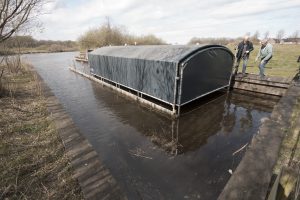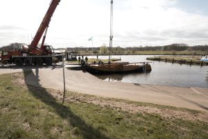 In de haven werd het botenhuis vastgelegd en alles aangesloten, klaar voor een nieuw seizoen. De zomp heeft z’n onderkomen in de haven van Dalfsen weer terug.