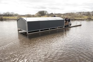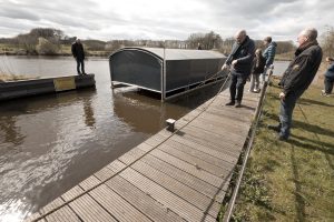 Ook moest eerst nog het drijvende botenhuis worden opgehaald. Dat was gisteren weer in elkaar gezet en in de Vecht gelaten met hulp van diverse vrijwilligers van de Vechtzomp. Inmiddels was Jan Weijdeman ook met zijn snelle en wendbare boot van de partij om “corrigerend” op te treden, want wind en stroming hadden best grote invloed op dit drijvend gebeuren.